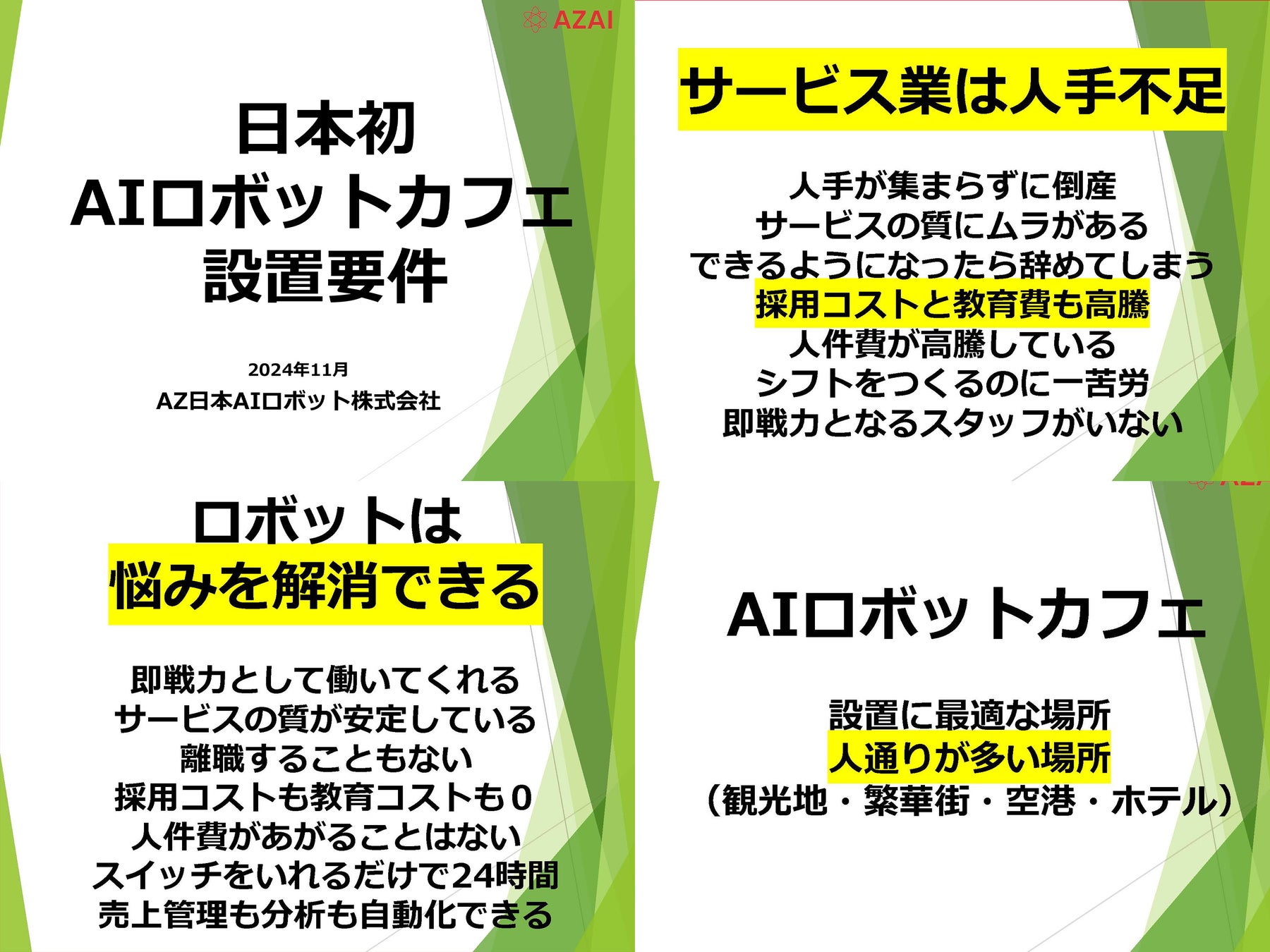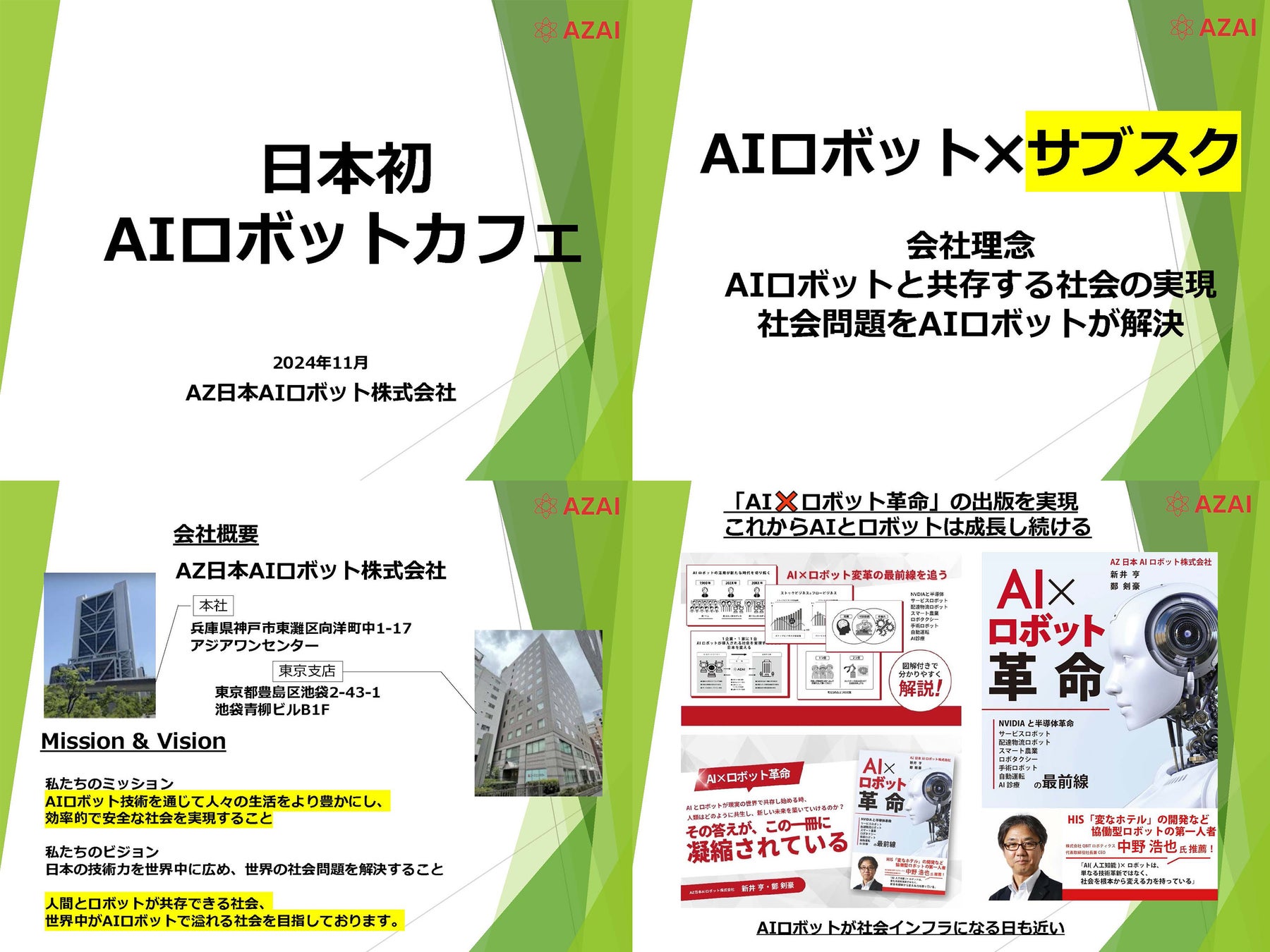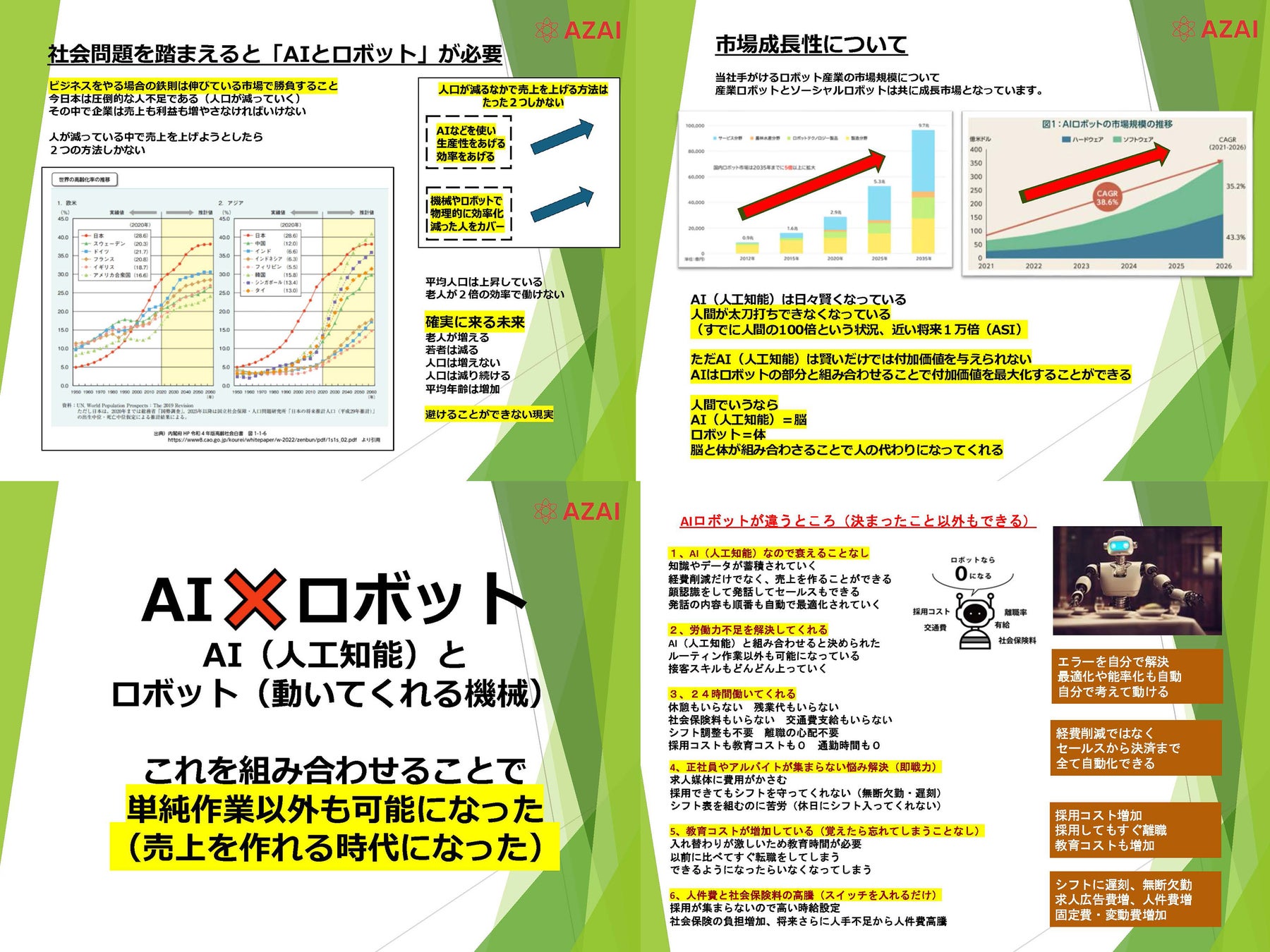 AZ日本AIロボット株式会社は、AIとロボットの力を活用して、日本社会が直面する人材不足の問題を解決し、持続可能なサービス提供を目指しています。